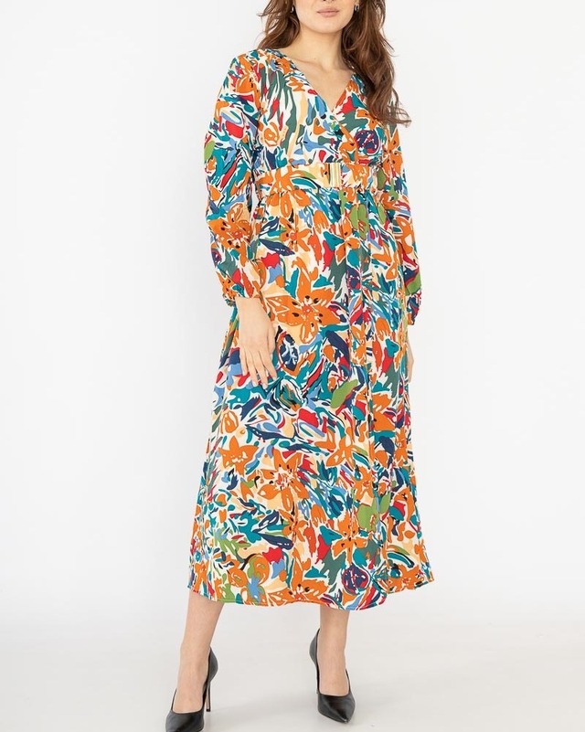 マーケット風柄が華やかな雰囲気を誘う ロングワンピース FRNCH 旅行にも