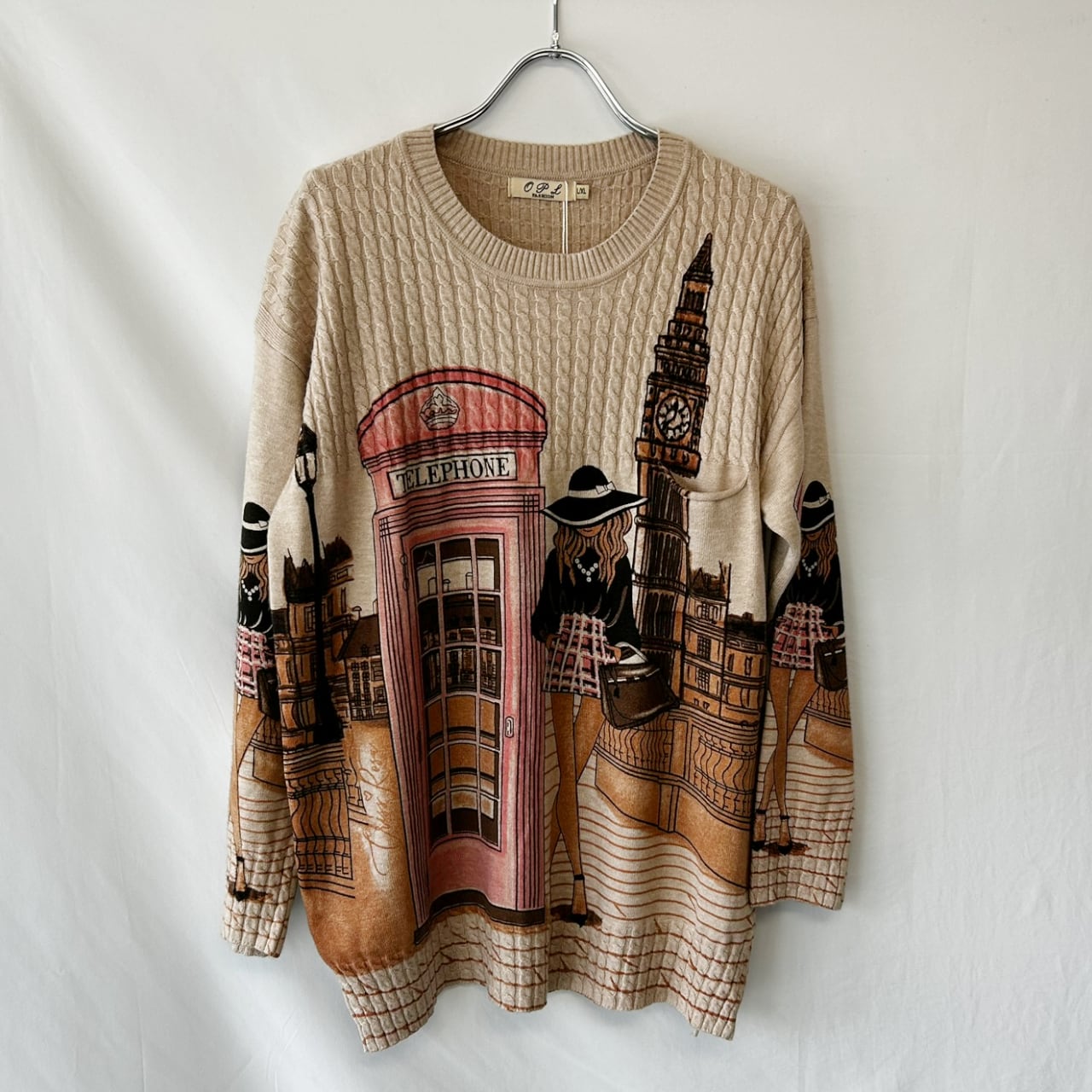 ロンドン風プリント ニットトップス レディース 長袖 ビッグベン&電話ボックス柄 カジュアル おしゃれセーター
