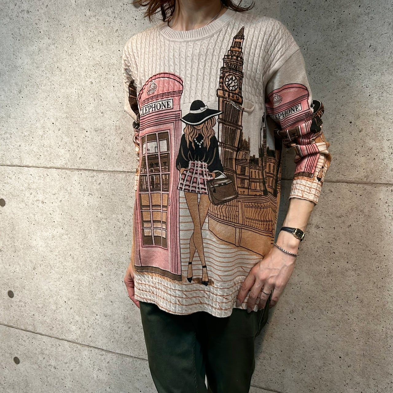 イギリス・ロンドンの街並みを思わせる、赤い電話ボックスとビッグベンのデザインが目を引くニットトップス。