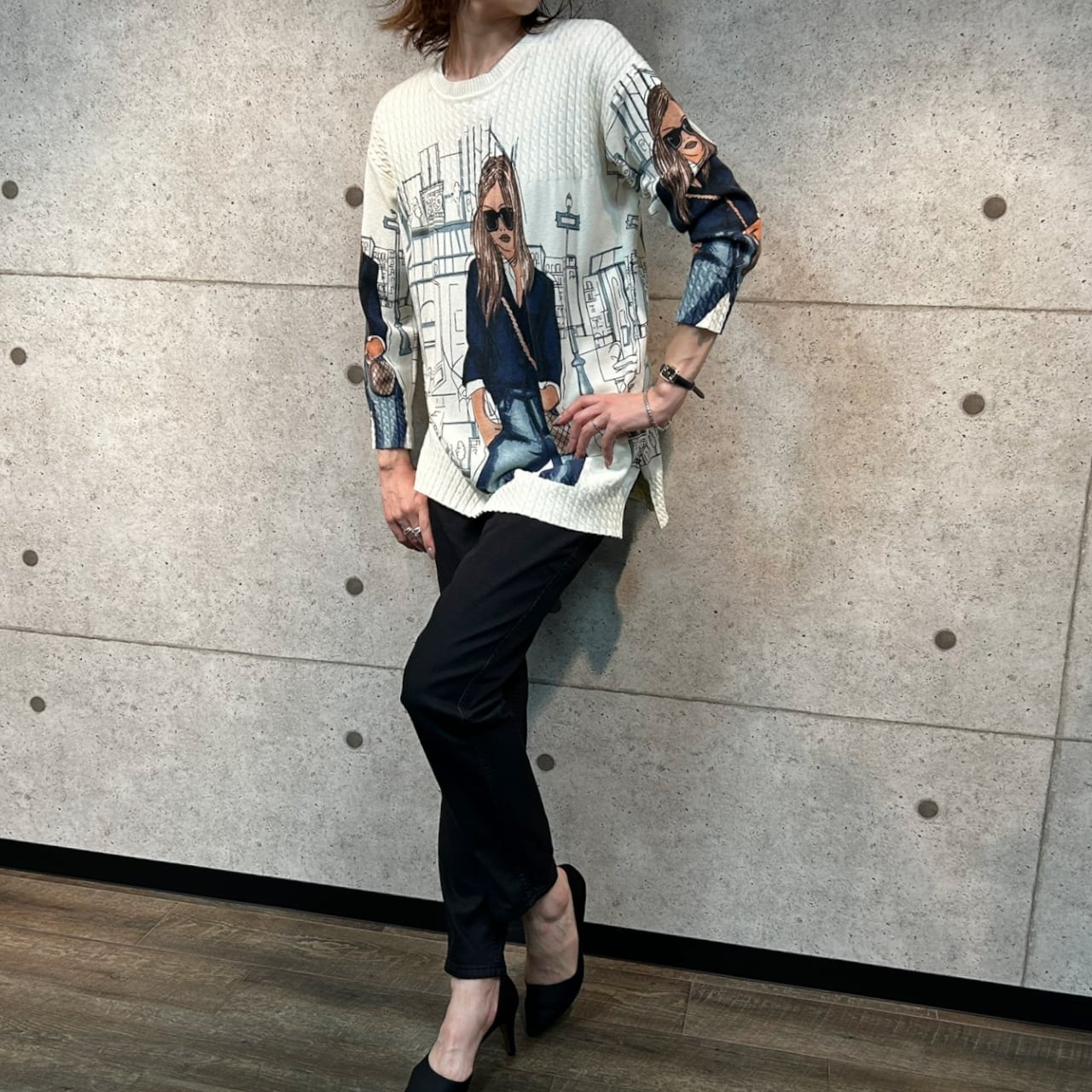 パリジェンヌ風 ニットトップス レディース 長袖 ストリートガール柄 シティプリント 大人カジュアル モードスタイル