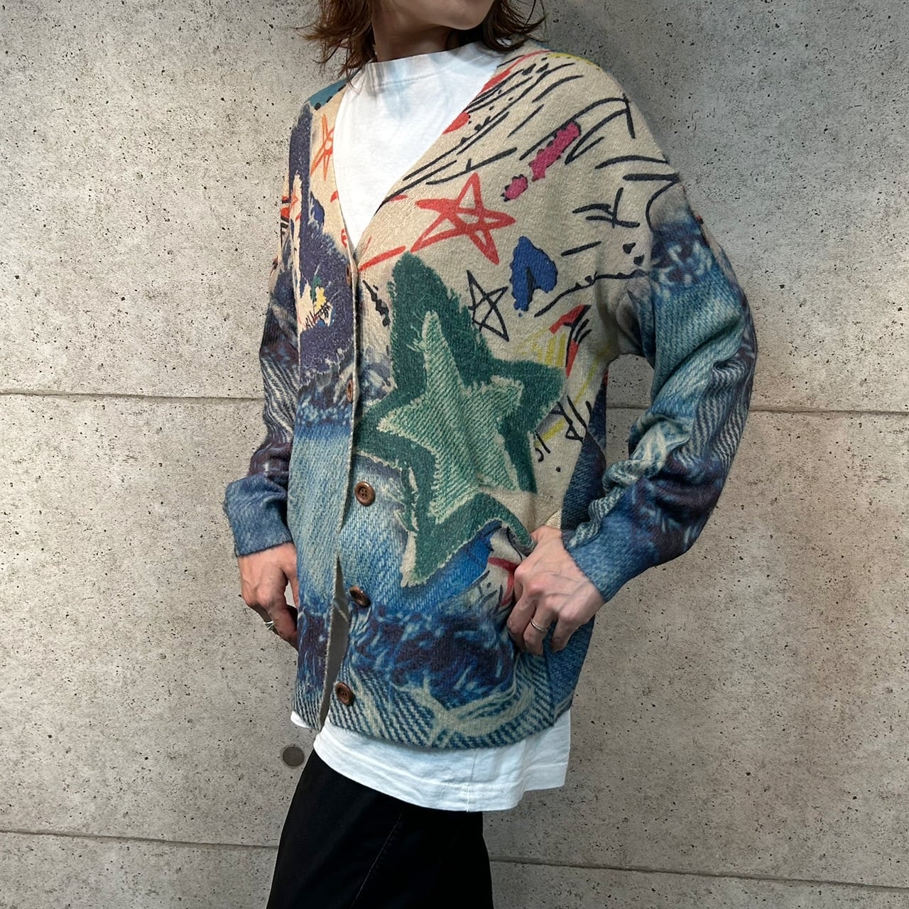 アート柄 ニットカーディガン レディース 星柄 カジュアル 個性派 カラフル 羽織り ゆったりシルエット 秋冬コーデ