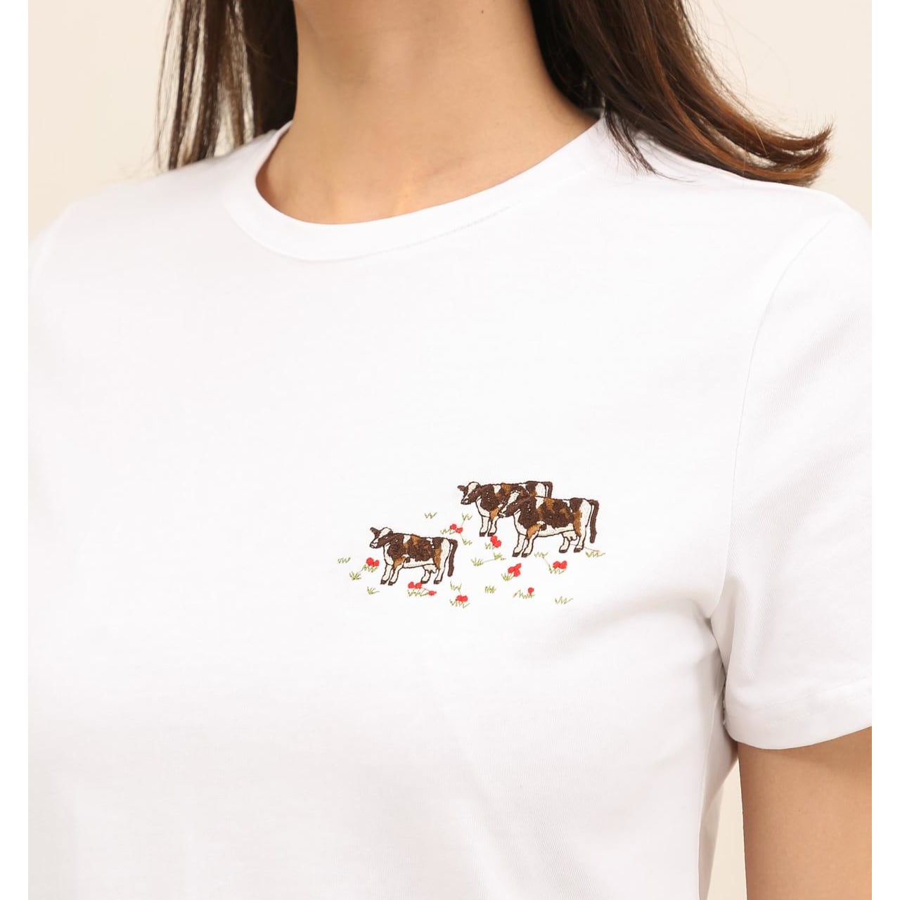 胸元のさりげない刺繍がアクセントになり、