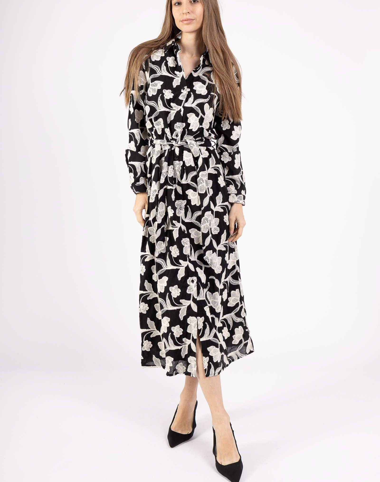 刺繍フラワー シャツワンピース ブラック|ロングワンピース 長袖 ウエストリボン 花柄ワンピース 大人ワンピース きれいめ レディース