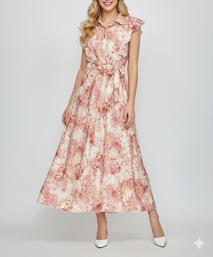 フラワープリント フリルワンピース|ロングワンピース ウエストリボン ノースリーブ シャツワンピース 大人可愛い 春夏 レディース