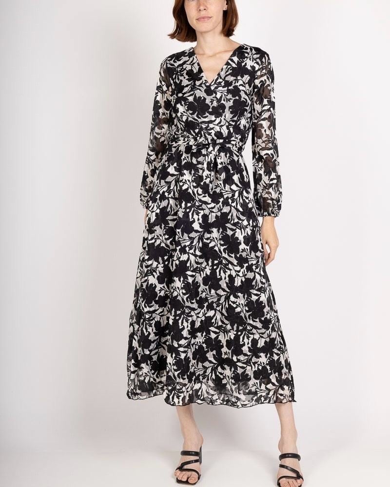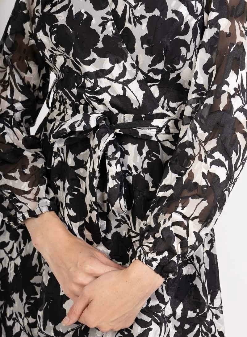 大人可愛い モノトーン花柄シフォンワンピース ロング丈 カシュクール ウエストリボン フレア きれいめ 上品 春夏秋 レディース