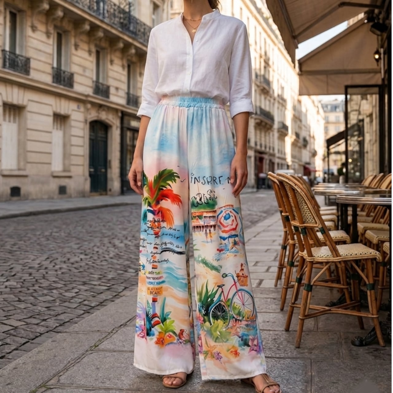 リゾートパンツ / ワイドパンツ / レディースパンツ / ゆったりパンツ / ウエストゴム / 体型カバー / 春夏パンツ / 旅行コーデ / セットアップ / リゾートファッション / 大人カジュアル / 個性派ファッション