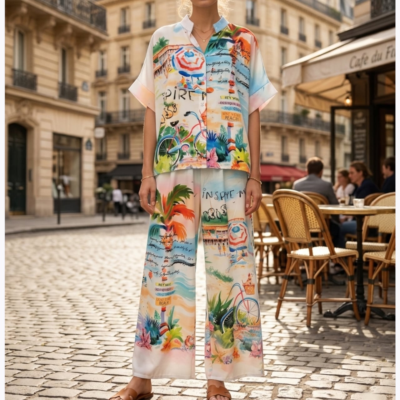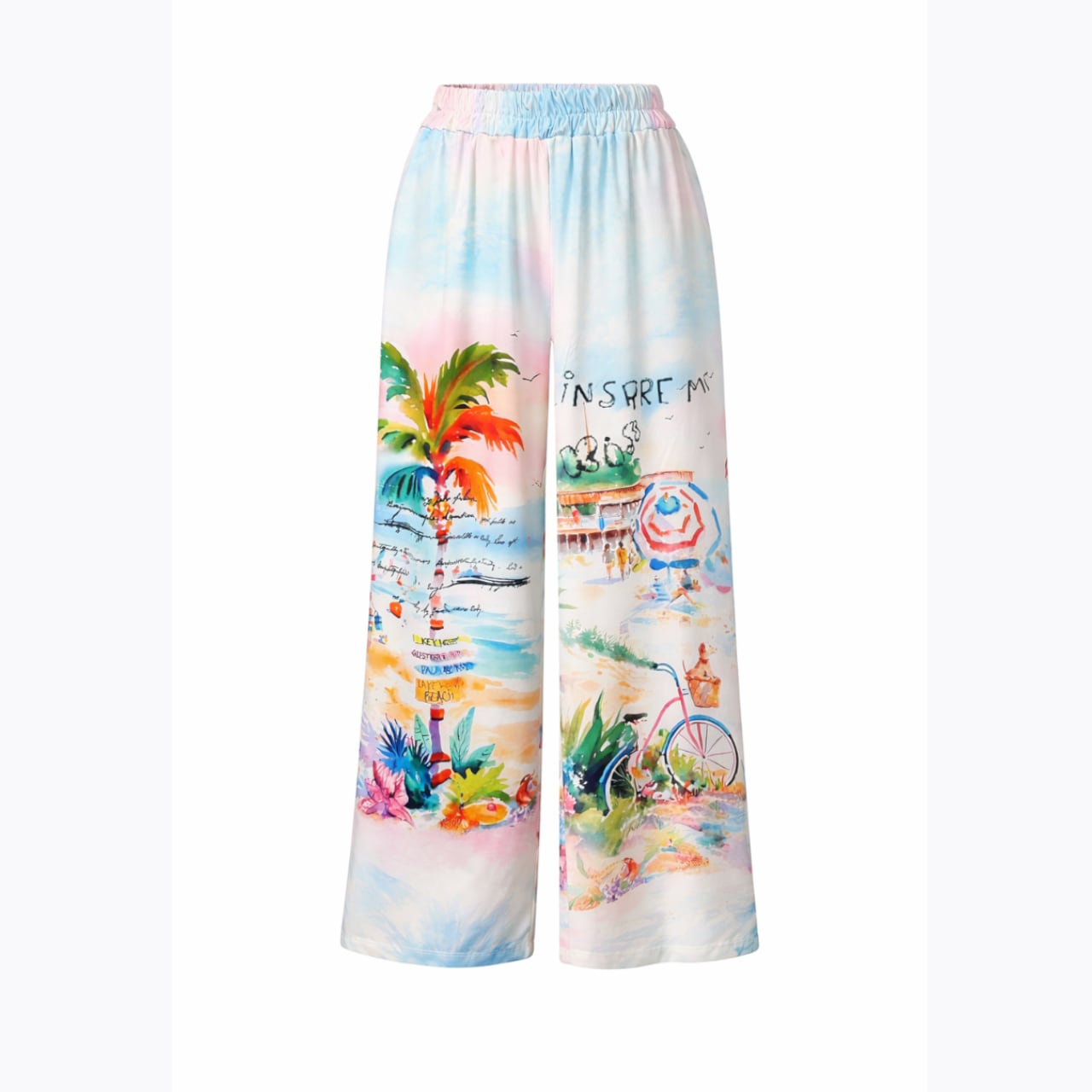 リゾートプリント ワイドパンツ レディース ウエストゴム ゆったり 体型カバー カラフル 旅行コーデ セットアップ対応 春夏 大人カジュアル